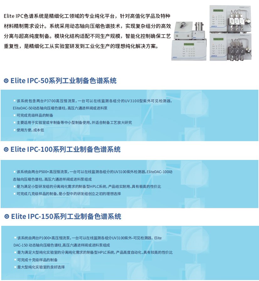 依利特科技高壓半制備液相色譜系統(tǒng)EClassical3500/3700、3140AP,將分析和半制備一體化,為您提供完整的分析和制備化合物的自動(dòng)HPLC應(yīng)用方案。該系統(tǒng)可以方便實(shí)現(xiàn)分析與半制備系統(tǒng)之間的切換,還可完成樣品進(jìn)樣、餾分收集等功能。依利特工業(yè)制備Elite IPC色譜系統(tǒng),完成從幾克級(jí)至十克級(jí)樣品的制備,是小型化合物開發(fā)和大型純化實(shí)驗(yàn)室的良好選擇。