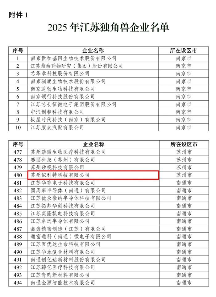 近日,江蘇省新質(zhì)生產(chǎn)力促進中心正式發(fā)布《關于發(fā)布 2025 年江蘇獨角獸企業(yè)評估結(jié)果的通知》,經(jīng)過嚴格遴選與專業(yè)評估,蘇州依利特科技有限公司憑借在技術創(chuàng)新、產(chǎn)業(yè)潛力與高質(zhì)量發(fā)展貢獻方面的突出表現(xiàn),成功榮登 2025 年江蘇獨角獸企業(yè)名單,成為江蘇省高成長企業(yè)群體中的代表之一。