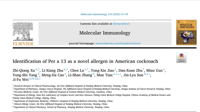 《Molecular Immunology》是國際免疫學領域權(quán)威期刊之一,由世界著名的學術(shù)出版商Elsevier公司出版發(fā)行,是美國SCI 數(shù)據(jù)庫收錄的核心期刊,2021年影響因子為4.4?!禡olecular Immunology》致力于免疫學研究領域的各個方向,尤其注重在細胞水平、生物化學水平及遺傳學水平,深入揭示各種免疫學現(xiàn)象的機制。在《Molecular Immunology》143(2022)41-49發(fā)表的《Identification of Per a 13 as a novel allergen inAmerican cockroach》一文中,首次在美洲大蠊(蟑螂的一種)中鑒定到一個屬于甘油醛3-磷酸脫氫酶(GAPDH)類型的過敏原,被國際組織認定為Per a 13。