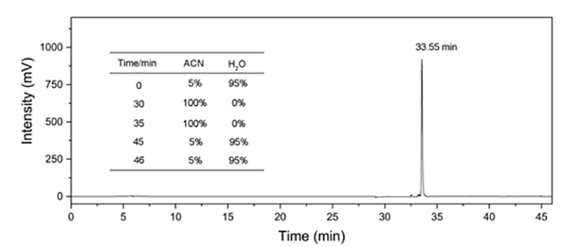 通過依利特EClassical 3140液相色譜儀搭配經(jīng)典SinoChrom ODS-BP色譜柱,對(duì)FmoccFFRRR肽的純度檢測(cè),結(jié)果顯示,F(xiàn)moccFFRRR肽的純度為97.3%。