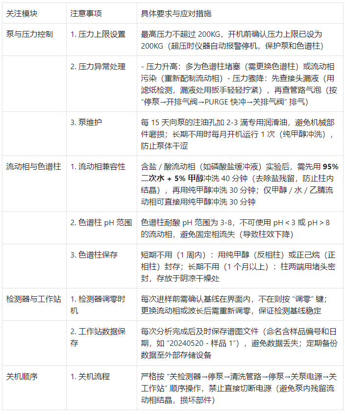 表格 3:HPLC 操作關(guān)鍵注意事項