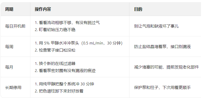 解決:趕緊停泵,用純水慢慢沖(0.2 mL/min 的流速沖 30 分鐘),再一點點換回原來的流動相;預(yù)防:記得先用水把鹽徹底溶解后,再慢慢倒有機相,邊倒邊攪才穩(wěn)妥。