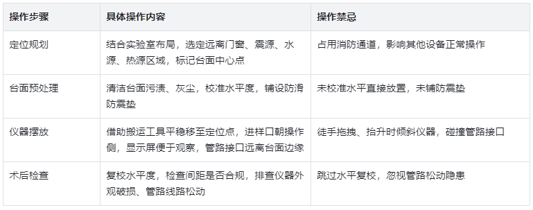 第四步,術(shù)后檢查。擺放完成后,再次用水平儀校準儀器水平狀態(tài),檢查儀器與臺面、周圍設(shè)備的距離是否符合要求,確認無遮擋、無擠壓;同時檢查儀器外觀是否有破損,管路、線路是否松動,確保放置后儀器處于安全待命狀態(tài)。