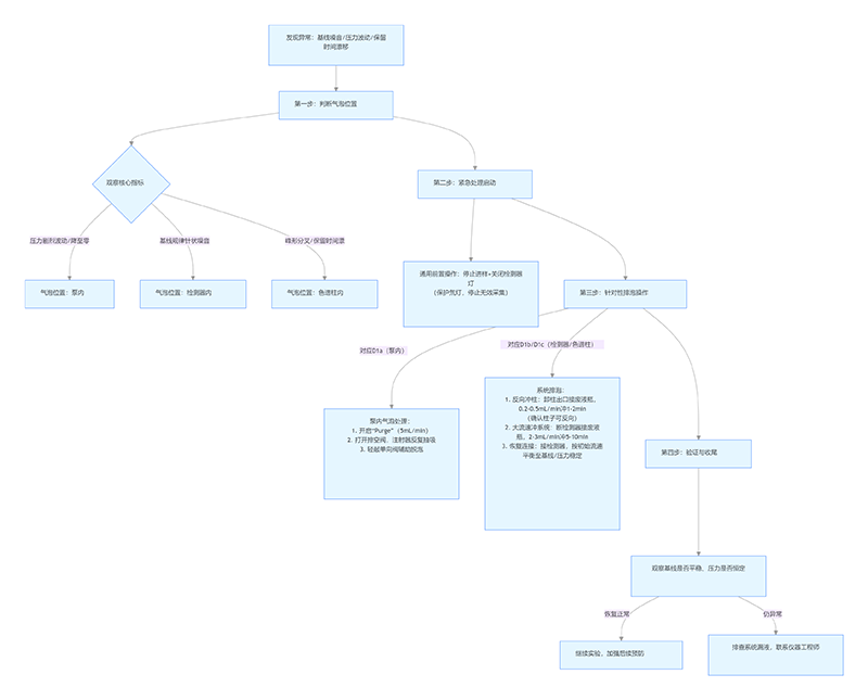要是發(fā)現(xiàn)壓力波動、基線有噪音,或者保留時間不穩(wěn)定,先別急著處理,得先搞清楚氣泡在哪個位置: