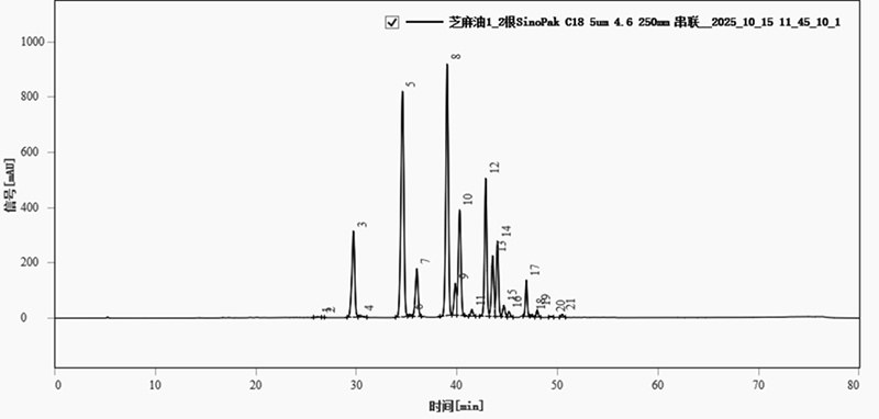 圖1. 根據(jù)GB/T 44614-2024方法分析芝麻油樣品的色譜圖