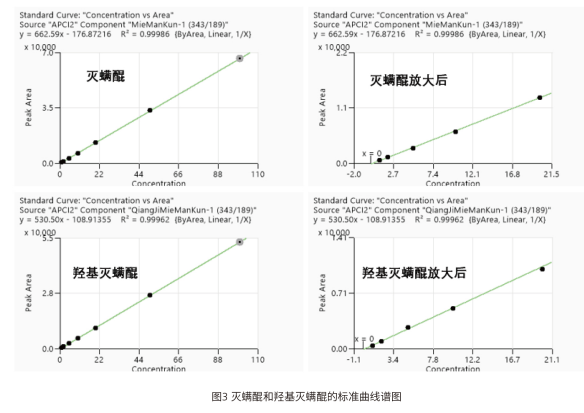 本文采用 EClassical 3200L-MS2 Vertical 9100 三重四極桿液質(zhì)聯(lián)用系統(tǒng),建立了快速、高靈敏度且可靠的 LC-MS/MS 方法,用于測(cè)定食品中滅螨醌和羥基滅螨醌,為該類化合物提供了高通量檢測(cè)手段,檢出限完全滿足相關(guān)標(biāo)準(zhǔn)要求。滅螨醌:y=530.50x-108.91355,R2=0.99962;羥基滅螨醌:線性方程及 R2 詳見完整譜圖,R2≥0.999)