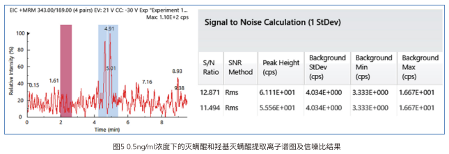 同時(shí)考察了該方法的儀器檢出限情況,在0.5ng/ml的濃度下,羥基滅螨醒和滅螨醒的的信噪比分別為11和12,如下圖所示,可見該方法靈敏度較高,完全滿足該標(biāo)準(zhǔn)的檢出要求。
