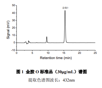 按照《中藥材及中藥飲片藥品檢驗補充檢驗方法和檢驗項目批準件》食藥監(jiān)稽函 [2012] 200 號文件中金胺 O 檢測方法,使用大連依利特分析儀器有限公司配置 DAD230 + 二極管陣列檢測器的高效液相色譜儀可以分析檢測中藥材和中藥飲片中的金胺 O,系統(tǒng)穩(wěn)定重復,線性相關性良好,檢出限低,通過光譜圖比對、峰純度計算功能,能夠準確定性,避免假陽性現(xiàn)象,滿足藥監(jiān)部門制定的標準要求。