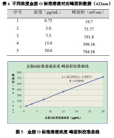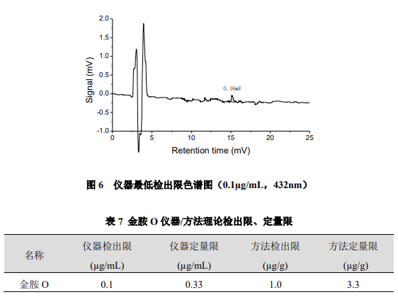 以峰高約為 3 倍信噪比對應濃度為儀器檢出限,以 10 倍信噪比計算儀器定量限,噪聲按 0.05mV 計算,金胺 O 儀器 / 方法理論檢出限、定量限結果如下。
