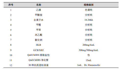 基質(zhì)混合標(biāo)準(zhǔn)工作溶液配制:取高濃度農(nóng)藥混合標(biāo)準(zhǔn)溶液,用空白樣品基質(zhì)溶液稀釋成定量限濃度的基質(zhì)混合標(biāo)準(zhǔn)工作溶液。