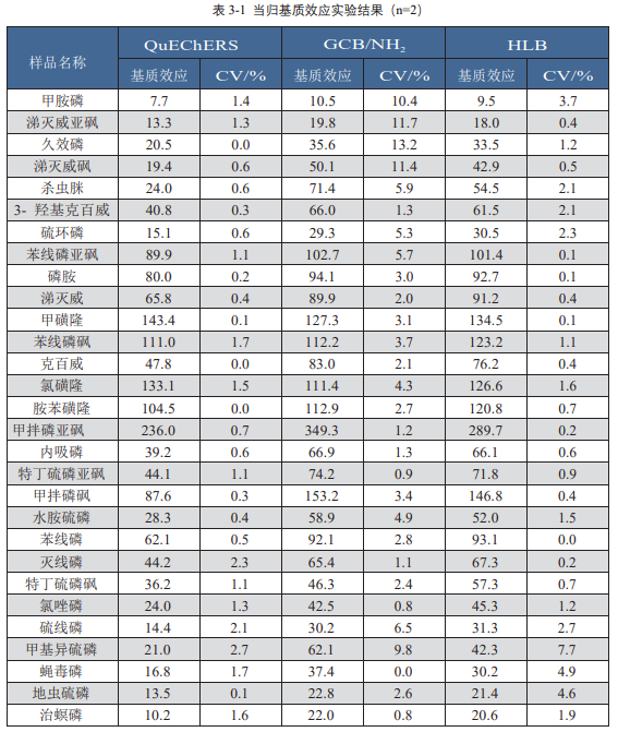 由表 3-2 可知,分別采用 QuEChERS 和固相萃取法處理當(dāng)歸中的 30 種農(nóng)藥殘留,HLB 處理的樣品,所有目標(biāo)物的加標(biāo)回收率均在 60~120% 之間,RSD 小于 20%;其他方法均有數(shù)量不等的目標(biāo)物回收率偏低的情況,不能滿(mǎn)足實(shí)驗(yàn)要求;由圖 1~4 可知,凈化液濃縮后均會(huì)有少量的揮發(fā)油,帶有揮發(fā)油的基質(zhì)容易引起較大的基質(zhì)效應(yīng),對(duì)于此類(lèi)化合物,從表 3-1 基質(zhì)效應(yīng)及表 3-2 回收率綜合分析來(lái)看,HLB 凈化柱的效果佳。