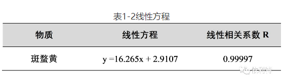 配制濃度分別為1μg/mL、2μg/mL、5μg/mL、25μg/mL、100μg/mL的標(biāo)準(zhǔn)工作液,按濃度由低至高進樣,以標(biāo)準(zhǔn)品濃度為橫坐標(biāo),峰面積為縱坐標(biāo),斑蝥黃的線性相關(guān)性結(jié)果如下。