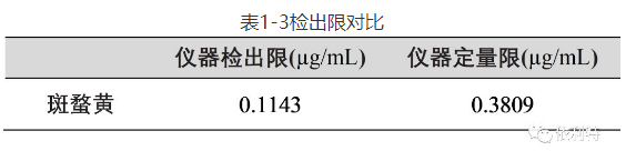 噪聲按0.04mV計算,峰高為3倍信噪比對應(yīng)的濃度為儀器檢出限,10倍信噪比對應(yīng)的濃度為儀器定量限,結(jié)果如下表所示。