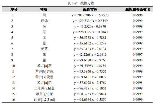將 16 種多環(huán)芳烴標(biāo)準(zhǔn)工作液,按 1.3.2 中色譜條件進(jìn)行分析,16 種多環(huán)芳烴線性如下表所示: