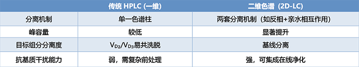 維生素D(VD)是維持人體鈣磷代謝平衡的關鍵營養(yǎng)素,其缺乏可導致兒童佝僂病和成人骨質(zhì)軟化癥。食品中VD主要以VD2(麥角鈣化醇)和VD3(膽鈣化醇)形式存在,兩者結(jié)構高度相似(僅側(cè)鏈雙鍵位置不同),傳統(tǒng)HPLC(一維)難以實現(xiàn)完全分離,易導致定量誤差。本文基于EClassical 3200 HPLC/3200L UHPLC構建二維液相色譜系統(tǒng)(2D-LC),結(jié)合GB 5009.296-2023《食品安全國家標準 食品中維生素D的測定》(第二法)要求,實現(xiàn)對食品中VD2和VD3的高效、精準檢測。