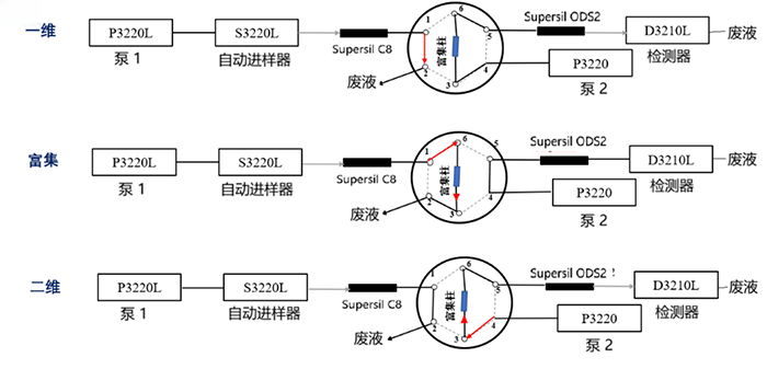 ① 除雜質(zhì):樣品進入一維柱,非目標組分排至廢液