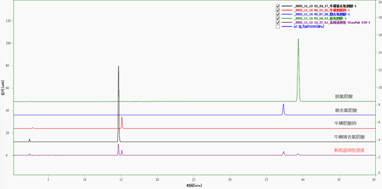 表1中的數(shù)據(jù)進一步驗證了該系統(tǒng)的合規(guī)性。各組分的理論塔板數(shù)均遠高于藥典不低于10000的要求;牛磺膽酸與?;秦i去氧膽酸的分離度為2.55,鵝去氧膽酸與脫氧膽酸的分離度為6.13,均滿足藥典規(guī)定的分離度分別大于2.0和1.5的要求。這些結(jié)果證明,所用色譜系統(tǒng)完全符合2025版藥典方法對系統(tǒng)適用性的要求,能夠確保后續(xù)含量測定的準確性與可靠性。