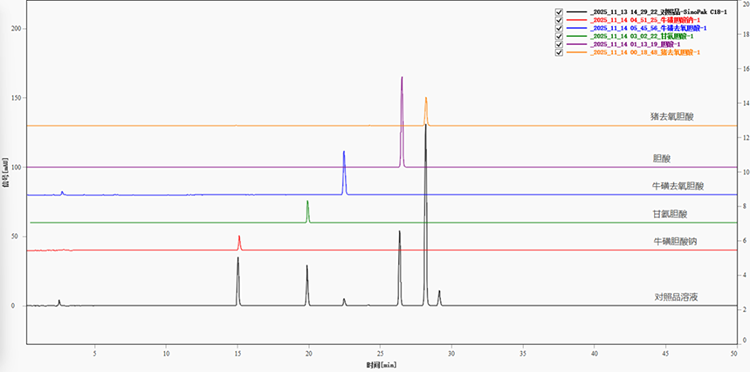 圖1顯示了人工牛黃膽酸類系統(tǒng)適用性溶液在SinoPak C18色譜柱上的分離色譜圖。圖中四個色譜峰(依次為?;秦i去氧膽酸、?;悄懰徕c、鵝去氧膽酸、脫氧膽酸)基線分離良好,峰形尖銳對稱,直觀表明該色譜系統(tǒng)對這幾類結(jié)構(gòu)相似的化合物具有優(yōu)異的分離能力。圖3為系統(tǒng)適用性溶液及對應單標在SinoPak C18色譜柱上分離的疊加色譜圖,進一步證實了系統(tǒng)適用性溶液與對照品溶液中對應峰的一致性。