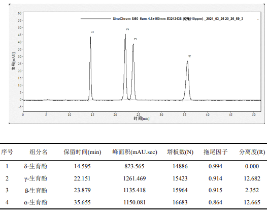 維生素 E 標(biāo)準(zhǔn)儲備溶液(1.000mg/mL):分別準(zhǔn)確稱取 α- 生育酚、β- 生育酚、γ- 生育酚和 δ- 生育酚各 50.0mg,用無水乙醇溶解后,轉(zhuǎn)移入 50mL 容量瓶中,定容至刻度,此溶液濃度約為 1.00mg/mL。將溶液轉(zhuǎn)移至棕色試劑瓶中,密封后在 - 20℃下避光保存,有效期 6 個月。