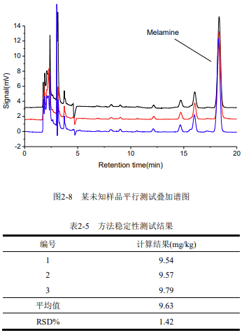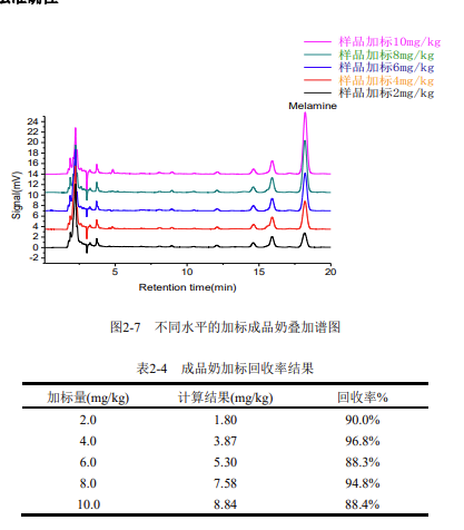 樣品測(cè)試過程中,應(yīng)保證其三聚氰胺含量在該線性范圍之內(nèi),若超出該范圍,需將樣品進(jìn)一步稀釋或濃縮。
