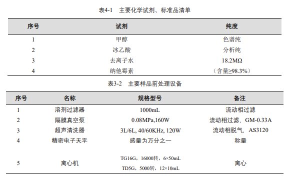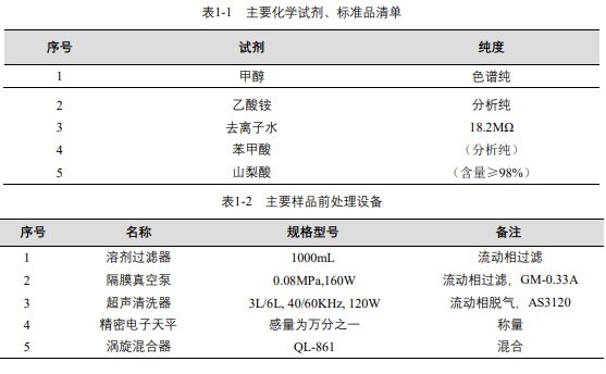 實驗過程中其它玻璃器皿還包括容量瓶 (100mL、50mL、25mL、10mL)、移液槍 (0~1000μL,0~5000μL)、移液槍槍頭 (1mL,5mL)、一次性 PVC 手套、一次性口罩、進樣針、濾膜等若干。