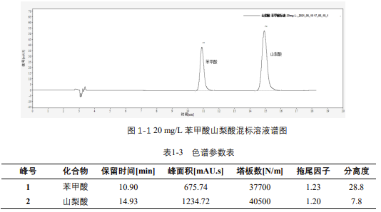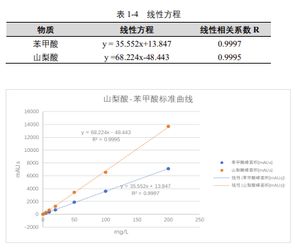 由表 1-4 可知,按照本解決方案提供的儀器及檢測方法進行分析,苯甲酸和山梨酸在 2-200mg/L 的濃度范圍內(nèi),線性良好,相關(guān)系數(shù)在 0.999 以上。