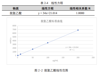 由表 2-4 可知,按照本解決方案提供的儀器及檢測方法進行分析,脫氫乙酸在 5-200μg/mL 的濃度范圍內(nèi),線性良好,相關(guān)系數(shù)達 1.0000。