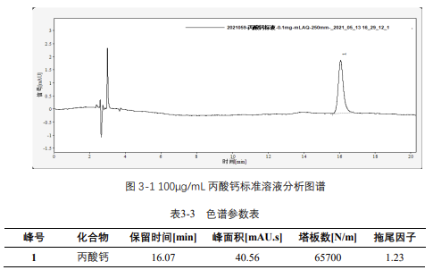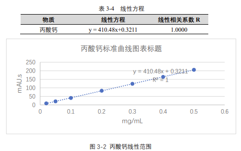 由表 3-4 可知,按照本解決方案提供的儀器及檢測方法進行分析,丙酸鈣在 20-500μg/mL 的濃度范圍內(nèi),線性良好,相關(guān)系數(shù)達 1.0000。