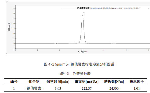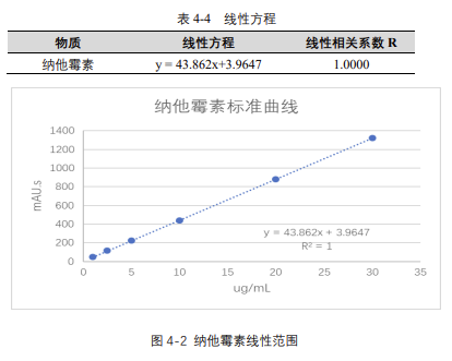 由表 4-4 可知,按照本解決方案提供的儀器及檢測方法進行分析,納他霉素在 1-30μg/mL 的濃度范圍內(nèi),線性良好,相關(guān)系數(shù)達 1.0000。
