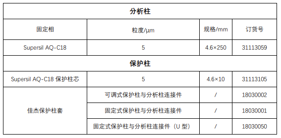 保護柱填料選擇的原則是好與分析柱填料保持一致,本解決方案中防腐劑的分析檢測使用的均是 Supersil AQ-C18 色譜柱,因此保護柱也應(yīng)使用 Supersil AQ-C18 填料。該類型色譜柱及保護柱的訂貨信息如下: