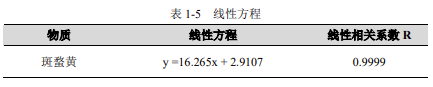 配制濃度分別為 1μg/mL、2μg/mL、5μg/mL、25μg/mL、100μg/mL 的標(biāo)準(zhǔn)工作液,按濃度由低至高進(jìn)樣,以標(biāo)準(zhǔn)品濃度為橫坐標(biāo),峰面積為縱坐標(biāo),斑蝥黃線性相關(guān)性結(jié)果如下。
