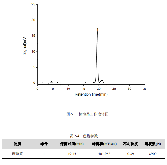 (圖 2-1 標(biāo)準(zhǔn)品工作液譜圖,橫坐標(biāo)為 Retention time (min),范圍 0-35,縱坐標(biāo)為 Signal (mV),范圍 0-25,圖中斑蝥黃對(duì)應(yīng)峰的保留時(shí)間約為 19.45min)