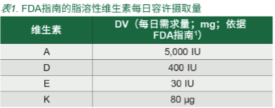 維生素是人體內(nèi)各種代謝功能所必需的微量營養(yǎng)素。維生素可分為水溶性和脂溶性維生素。脂溶性維生素 (FSV) 主要由維生素 A、D、E 和 K 組成,儲(chǔ)存在肝臟和脂肪組織中,消除速率比水溶性維生素慢。因此,人體不需要經(jīng)常補(bǔ)充 FSV。FDA 建議人體 FSV 推薦攝入量 / 耐受量見表 1。