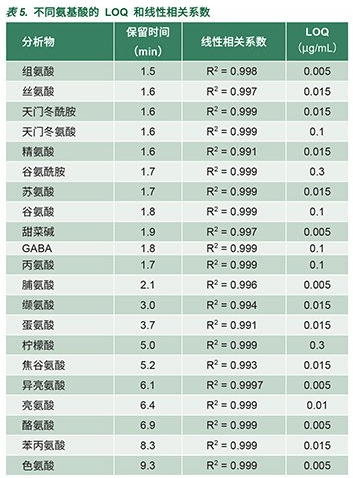 線性與檢出限:所有氨基酸線性相關系數(shù) R2 均 > 0.98(部分如天門冬酰胺 R2=0.999),LOQ(定量限)低(低 0.005μg/mL,如組氨酸、甜菜堿、脯氨酸等),滿足微量分析需求(詳見表 5);