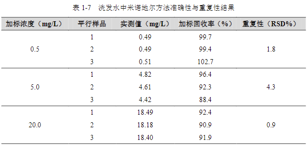 在添加濃度 0.5mg/L、5.0mg/L、20.0mg/L 濃度范圍內(nèi),測(cè)得回收率 88.4%~102.7%,相對(duì)標(biāo)準(zhǔn)偏差為 0.9%~4.3%。