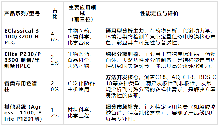 “分析+制備”雙輪驅(qū)動格局形成:EClassical分析系統(tǒng)與Elite P制備系統(tǒng)合計(jì)支撐了68%的研究工作,清晰勾勒出依利特在科研實(shí)驗(yàn)室“從分析檢測到制備純化”的全流程解決方案能力。