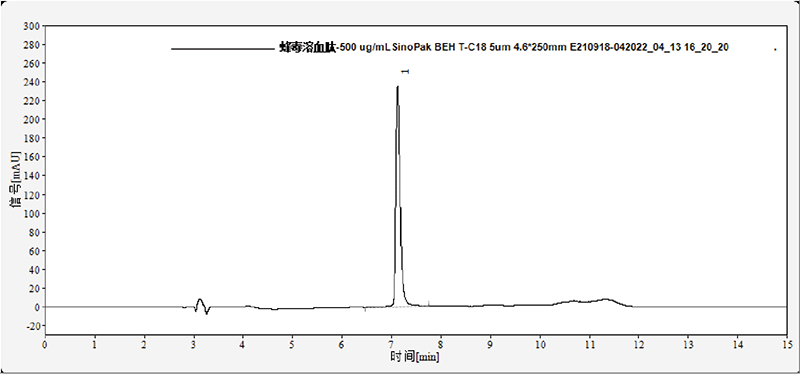 蜂毒溶血肽是一種由26個(gè)氨基酸組成的多肽,呈堿性,易溶于水,是一種人類所知的抗炎性強(qiáng)的物質(zhì)之一。依利特參考GB/T 40486-2021,采用新推出SinoPak BEH T-C18 5 μm色譜柱對蜂毒干粉中蜂毒溶血肽進(jìn)行分析檢測,所得數(shù)據(jù)可供客戶參考使用。
