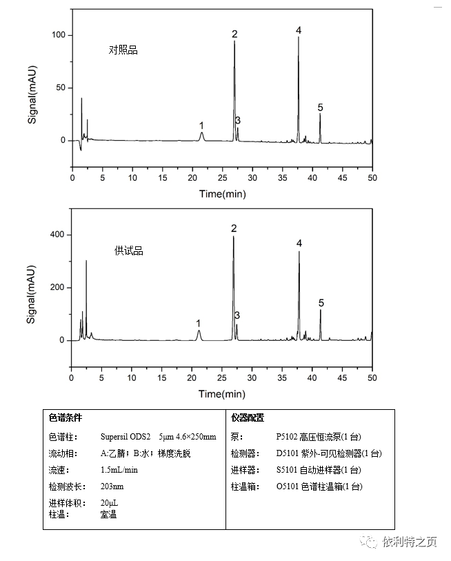 2.供試品溶液:取裝量差異項下的本品內(nèi)容物,研細(xì),取約25mg,精密稱定,置于具塞錐形瓶中,精密加入70%甲醇10mL,密塞,稱定重量,超聲處理(功率250W,頻率333kHz)10min,取出,放冷,再稱定重量,用70%甲醇補(bǔ)足減失的重量,搖勻,過濾,取濾液,即得。